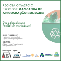 A Prefeitura de Passo Fundo é parceira do Projeto Recicla Comércio da Acisa, que está promovendo a campanha de arrecadação solidária para ajudar diversas famílias de recicladores, pessoas que exercem um papel fundamental na sociedade com um trabalho que dá destino correto aos resíduos recicláveis gerados na cidade.