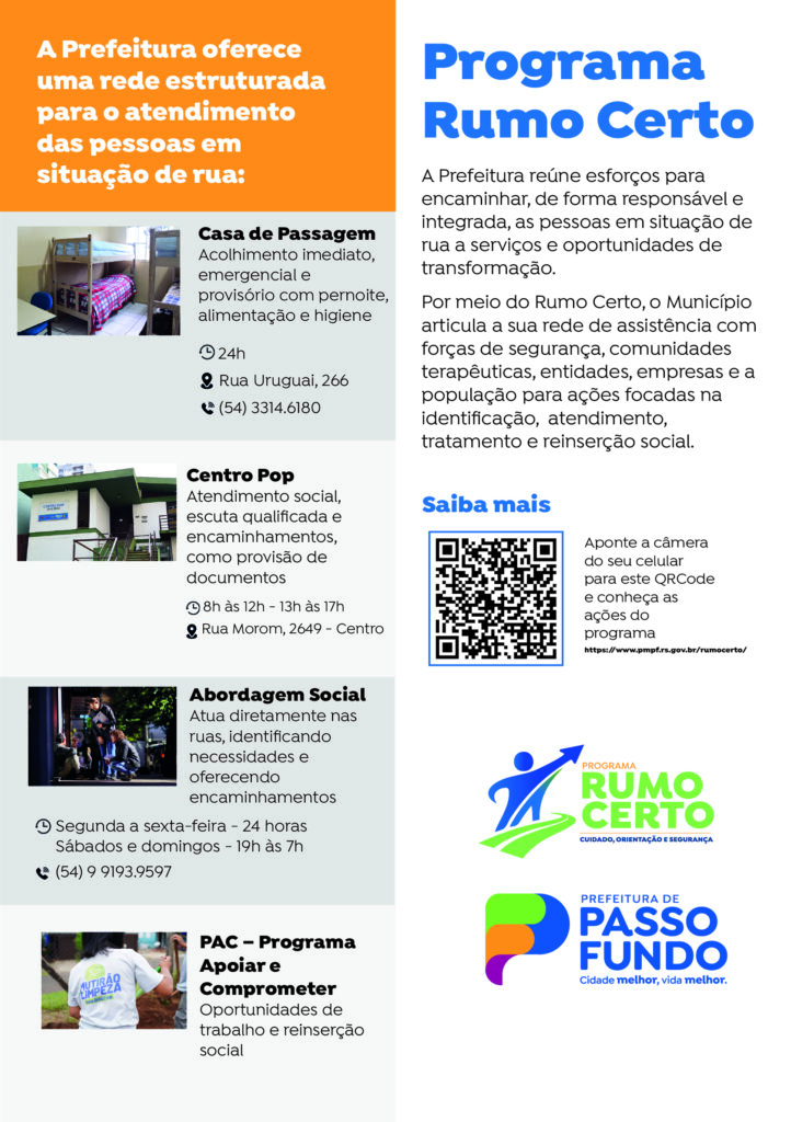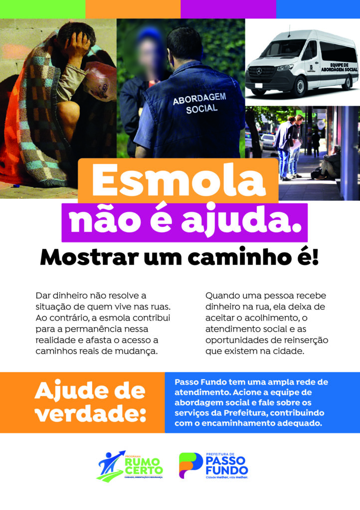 Ajude de verdade: Passo Fundo tem uma ampla rede de atendimento. Acione a equipe de abordagem social e fale sobre os serviços da Prefeitura, contribuindo com o encaminhamento adequado.